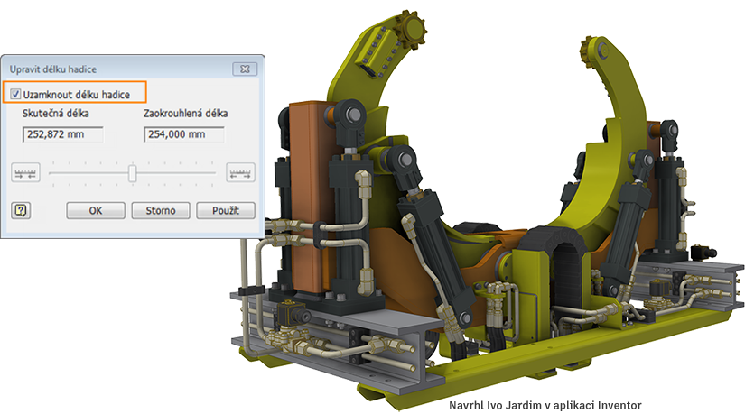 Nová možnost uzamknutí délky hadice umožňuje vypočítat přesnou hodnotu délky hadice. Když je tato možnost vybrána a komponenty se přesunou nebo posunou, zabrání se díky adaptivitě změně délky hadice.