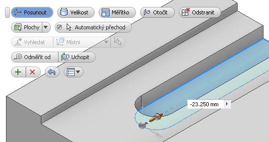 Upravit přímo možné prvek plochy pouze otočit nebo přesunout do jiného umístění. Pokud možnost Automatický přechod není vybrána, zachová se toto chování a plocha se přesune do nového umístění. Pokud je tato možnost vybrána, upraví se celková délka prvku plochy.