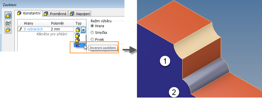 Tato nová možnost zaoblení byla přidána na základě vaší zpětné vazby. Zaoblení můžete vytvořit s 1) konvexními nebo 2) konkávními hranami.