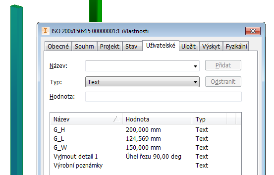 Hodnoty vytvořené pomocí příkazu Oříznout/prodloužit za účelem vyříznutí úhlů u členů rámové konstrukce jsou dostupné na kartě iVlastnosti/Vlastní jako Vyjmout detail1, Vyjmout detail2 atd. Mohou být také zahrnuty v rozpisce a kusovníku. Kromě toho parametr G_L generátoru rámových konstrukcí udává správné hodnoty délky.
