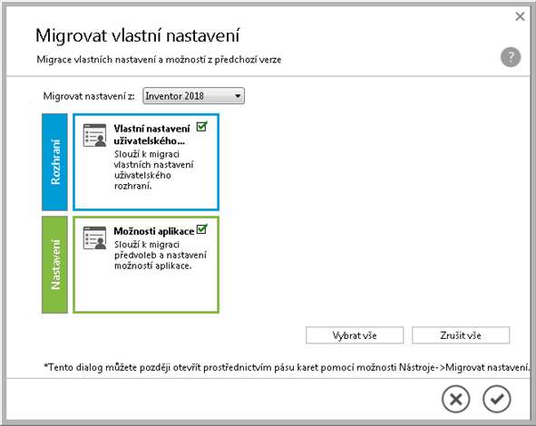 Pomocí migrace vlastních nastavení můžete přenést svá existující nastavení přizpůsobení a možností aplikace do nejnovější verze aplikace Inventor. Správci mohou použití této možnosti v rozmístěních dále kontrolovat.