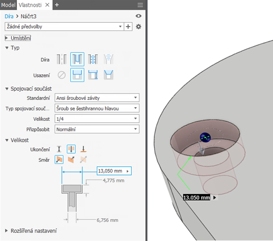 Nový příkaz Díra je rychlejší a efektivnější, protože inteligentně odvozuje umístění díry z vašich interakcí. Můžete použít kótové a koncentrické vazby, aniž byste nejdříve vytvořili náčrt. Poté můžete přepínat mezi úpravami prvku a náčrtu bez nutnosti ukončení příkazu.
