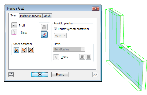 Mnoho uživatelů žádalo o možnost vystředit plechovou součást podle její tloušťky. Vyslyšeli jsme vás. Příkaz Plocha nyní podporuje vysunutí od středové roviny, což umožňuje vytvoření symetrické plochy.