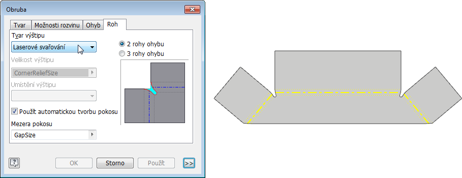 Rohový výštip lineárního svaru končí v bodě. Tvar rohového výštipu obloukového svaru končí segmentem přímé čáry. Nový rohový výštip laserového svaru končí tečným obloukem a je vhodnější pro laserové řezání součástí.