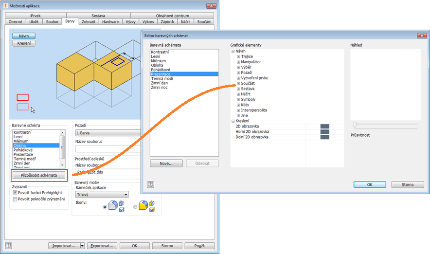 Editor barevných schémat je nainstalovaný jako součást aplikace Inventor 2019. Dostanete se k němu pomocí dialogu Možnosti aplikace > karty Barva. Přizpůsobení se ukládají do souboru XML možností aplikace.