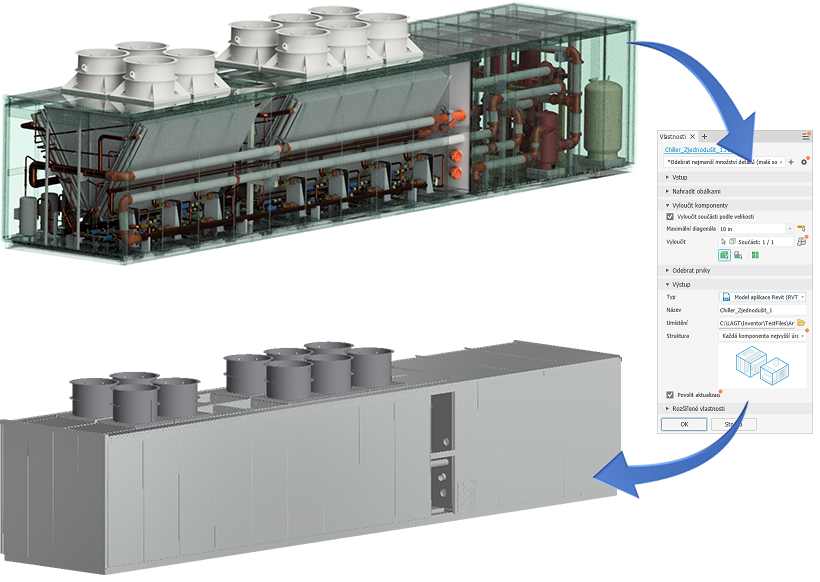 - Příkaz Zjednodušit je integrován do příkazu exportu do souboru RVT. Díky tomu není nutné provádět tyto úlohy samostatně.