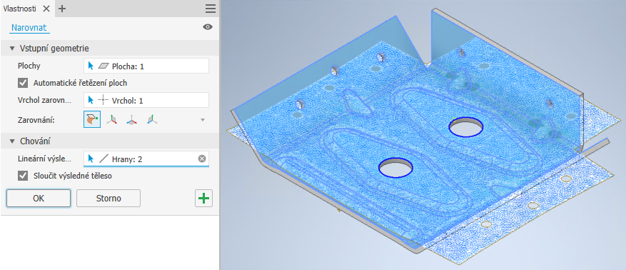 Příkaz Narovnat byl v této verzi dále vylepšen díky možnosti výběru zarovnání výsledků s modelem, nebo rovinami XY, XZ nebo YZ. Můžete také vybrat více rovinných děr, které chcete nastavit jako tuhé.
