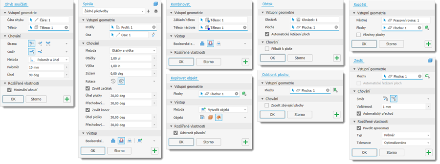 Využití panelů vlastností je dále rozšiřováno do dalších oblastí aplikace Inventor. Nyní můžete pomocí zjednodušeného pracovního postupu panelu vlastností pracovat s příkazy Ohyb, Spirála, Kombinovat, Kopírovat objekt, Obtisk, Odstranit plochu, Rozdělit, Zesílení/odsazení a všemi příkazy Generátoru rámových konstrukcí.