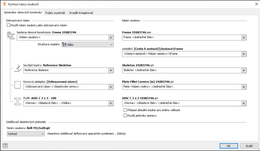 - Znovu jsme vylepšili dialog pojmenování souborů, takže můžete podrobněji ovládat schémata pojmenování komponent generátoru rámových konstrukcí. Nová možnost umožňuje nastavit název souboru komponenty tak, aby byl stejný jako zobrazovaný název v prohlížeči.