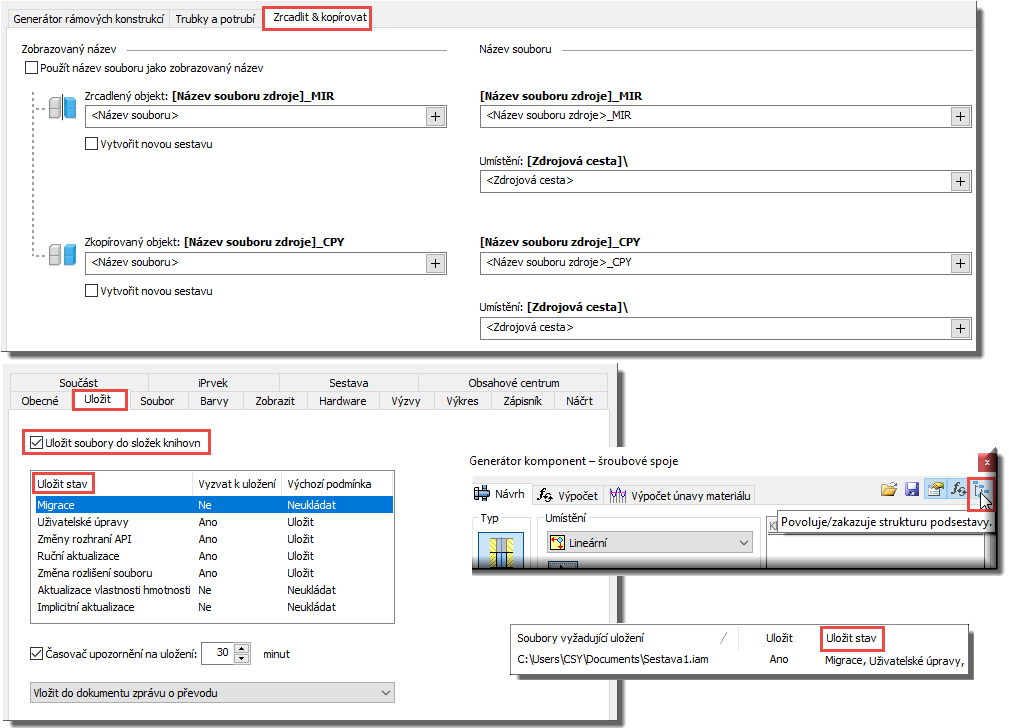 - Při ukládání souborů narazíte na nové možnosti, které umožňují nastavit, zda se mají soubory ve výchozím nastavení ukládat, nebo ne. Nový sloupec stavu uložení v dialogu Uložit vám pomůže pochopit, u kterých souborů aplikace Inventor zobrazí výzvu k uložení a proč.