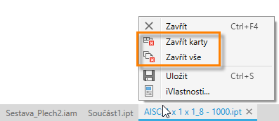 Pomocí nových možností v místní nabídce, Zavřít karty a Zavřít vše, můžete rychle zavřít všechny otevřené dokumenty. K novým možnostem se dostanete prostřednictvím místní nabídky otevřené karty.