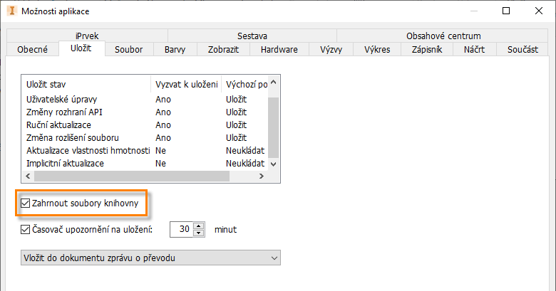 V zájmu větší přehlednosti bylo zaškrtávací políčko Uložit soubory do složek knihovny přejmenováno na Zahrnout soubory knihovny. Karta Uložit vám umožňuje obecně určit typ úprav, k jejichž uložení chcete být vyzváni. Nastavení Zahrnout soubory knihovny umožňuje určit, zda mají být ve výzvě zahrnuty soubory knihovny.