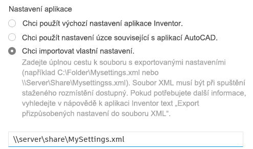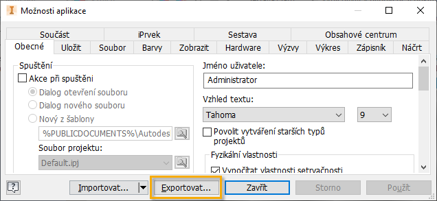 | V dialogu Možnosti aplikace klikněte na tlačítko Exportovat. Příkaz Exportovat uloží aktuální možnosti aplikace a nastavení v dialogu „iLogic – konfigurace“ do souboru XML.
