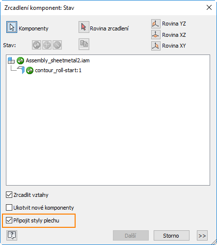 Příkaz Zrcadlit komponentu nyní rozpoznává plechové součásti a umožňuje připojit styl plechu ze zdrojové komponenty k zrcadlené kopii.