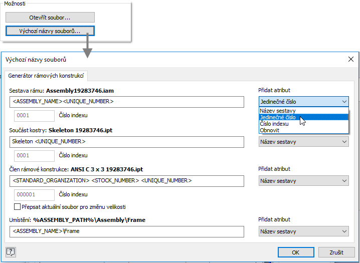 V dialogu Výchozí názvy souborů rozklikněte rozevírací seznamy Přidat atribut a nakonfigurujte v nich schéma pojmenování.