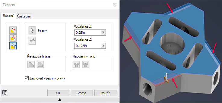 Při provádění zkosení vzdálenost-vzdálenost, úplných nebo částečných, můžete vybrat více nedotýkajících se hran.