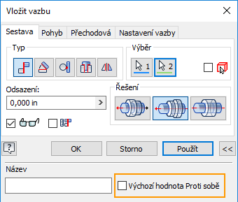 Při vytváření axiální vazby se aplikace Inventor ve výchozím nastavení pokusí předpovědět nejlepší řešení pro vytvoření vazby. Nové nastavení Výchozí hodnota Proti sobě umožňuje trvale vrátit starší chování, které ve výchozím nastavení používalo hodnotu Proti sobě.