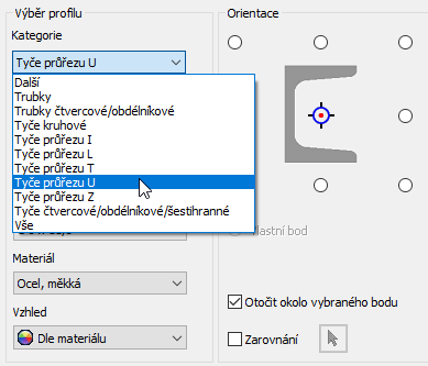 Do dialogu Výběr profilu u příkazů Vložit a Změnit byla přidána nová část – Kategorie – která usnadňuje vyhledávání konkrétní rodiny. Pokud vyberete kategorii konstrukčního tvaru, použije se u seznamu Rodina filtr, který zobrazí pouze dostupné možnosti.