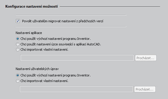 Pokud je při instalaci aplikace Inventor 2019 detekována starší podporovaná verze, zobrazí se dialog Migrace uživatelských nastavení. Tento dialog použijte k zahrnutí vašich nastavení uživatelských úprav a možností do aplikace Inventor, aniž by bylo nutné použít proces exportu a importu souboru XML.