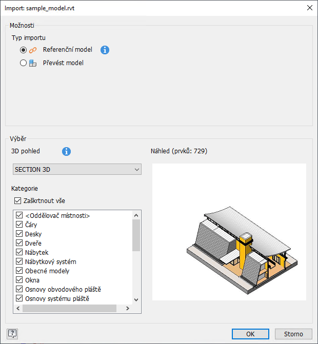 Nyní můžete určit, které kategorie z aplikace Revit chcete zahrnout do importovaného modelu nebo je z něj vyloučit. Stačí vybrat 3D pohled, zrušit výběr kategorií, které nechcete zahrnout, a následně model importovat.