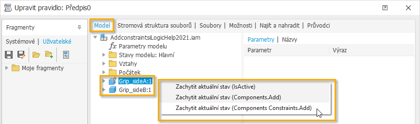 - V souboru sestavy v dialogu Upravit pravidlo na kartě Model proveďte vícenásobný výběr názvů součástí, klikněte pravým tlačítkem a v místní nabídce vyberte položku Capture.Current.State (Components Constraints.Add).