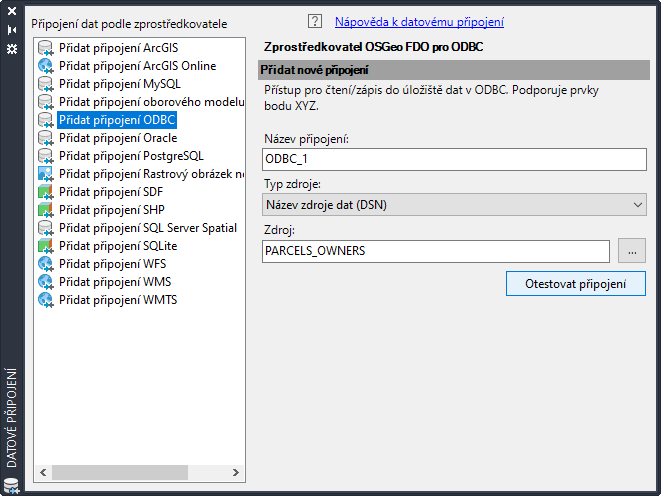 Určete nové spojení v okně Datové připojení. Ze zdroje ODBC nepřidávejte do mapy žádné specifické hladiny tříd prvků. Při připojení ke zdroji ODBC se vám v aplikaci AutoCAD Map 3D toolset automaticky zpřístupní všechna data.