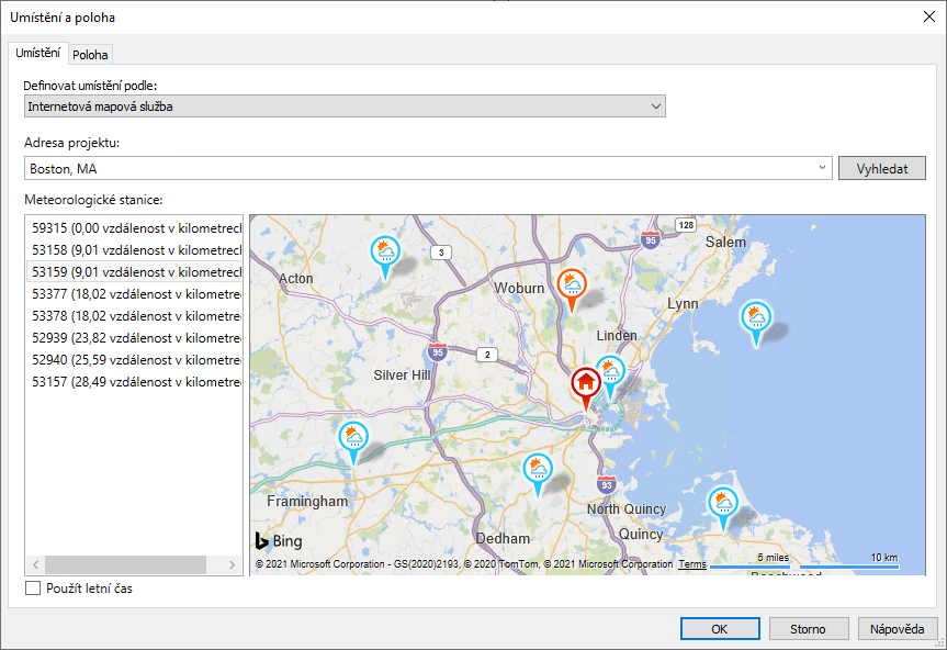 Před provedením energetické optimalizace modelu budovy určete její geografické umístění a vyberte nejbližší meteorologickou stanici.