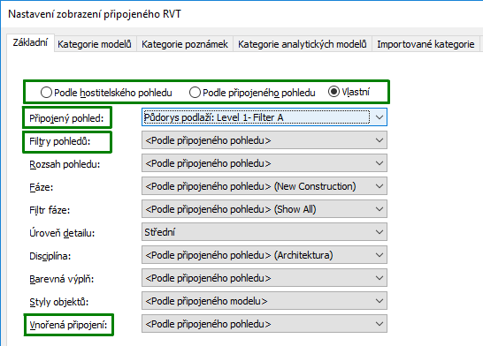 K ovládání použití filtrů připojených modelů v pohledu hostitele slouží nastavení v dialogu Nastavení zobrazení připojeného souboru RVT.