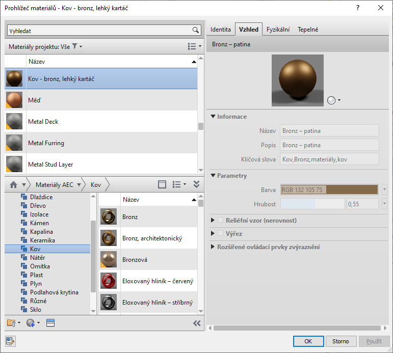 Dialog Prohlížeč materiálů použijte k vyhledání a správě materiálů pro prvky.