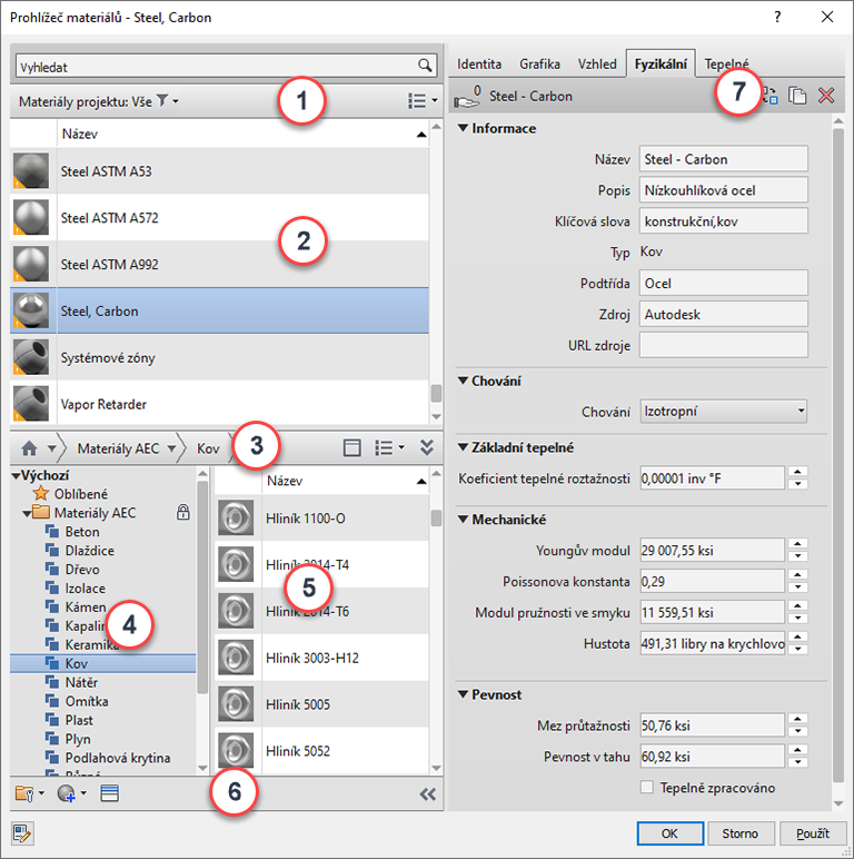 | 7 | Když je materiál vybrán v seznamu knihovny (levé podokno), v pravém podokně se zobrazí karty (položky) asociované s tímto materiálem. Pohled na vlastnosti a položky materiálů zobrazíte kliknutím na karty (například Identita nebo Vzhled). Při zobrazení materiálů v knihovnách jsou vlastnosti určeny pouze ke čtení. |