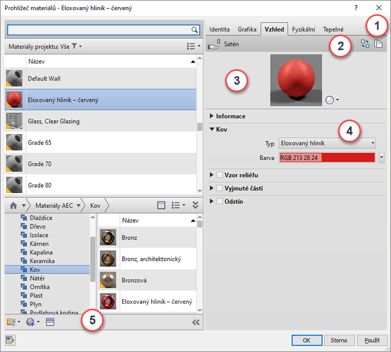 | 4 | Panel Vlastnosti: Slouží k zobrazení a správě detailních vlastností vybrané položky. Název a popis položky se zobrazí pod rozevíracím panelem informací. Výše uvedený příklad zobrazuje vlastnosti kovu zobrazené (rozbalené) pro položku vzhledu Eloxovaná – červená. Sadu vlastností, které se zobrazují například pro kapalinu, se liší od sad vlastností zobrazených pro plech. |