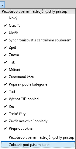 Panel nástrojů Rychlý přístup je možné zobrazit nad nebo pod pásem karet. Chcete-li provést změnu nastavení, na panelu nástrojů Rychlý přístup klikněte na rozevírací seznam Přizpůsobení panelu nástrojů Rychlý přístup