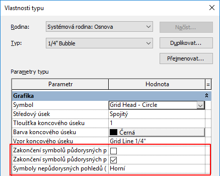 - Chcete-li zobrazit bubliny osnovy v počátečním bodu čar osnovy v půdorysném pohledu, vyberte položku Symboly půdorysného pohledu – konec 1.