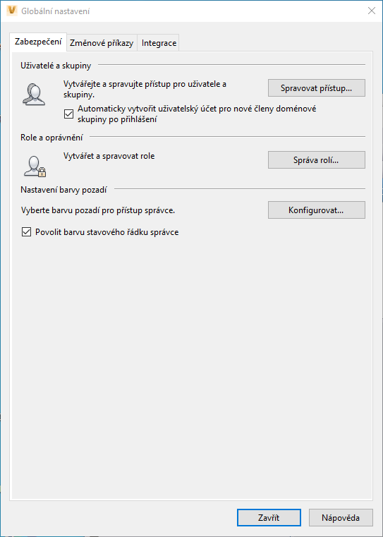 Karta Globální nastavení zabezpečení obsahuje možnosti udělování přístupových práv k úložišti a přiřazování uživatelských oprávnění. Můžete také vytvářet skupiny uživatelů a skupinám přiřazovat přístupová práva a role. Role přiřazené uživateli nebo skupině určují oprávnění uživatele nebo členů skupiny.