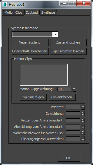 Mit den Optionen auf der Registerkarte "Synthese" fügen Sie Objekte hinzu, die synthetisiert werden sollen, wählen Übergangspunkte für Verschmelzungen aus und führen die Synthese durch. Bei der Synthese werden auf jedes angegebene Objekt, abhängig von der verhaltensgesteuerten Bewegung seines Vertreters, verschiedene Abfolgen von Motion-Clips angewendet.