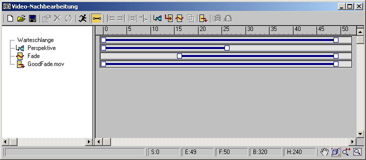 In dieser Warteschlange sind alle richtigen Aktionen in der richtigen Reihenfolge zu sehen. Das Problem liegt im Zeitablauf und in der Positionierung der Bereichsleisten. Die wahrscheinlichste Ursache des Problems ist die unnötige Aktivierung der Option "Auswahl aufeinander folgend". Damit die Aktion "Ausblenden" richtig funktioniert, muss sie mit der Animation so lange überlappen, wie das Ausblenden dauern soll. Sie müssen dabei die Anzahl der Frames in Betracht ziehen, bei denen die Szene ausgeblendet werden soll.