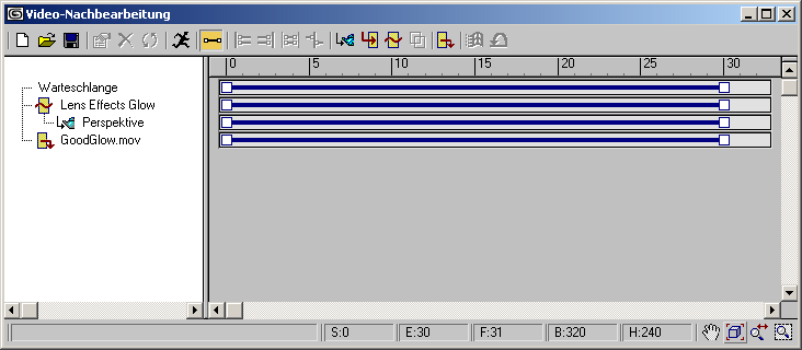 Wieder sind in dieser Warteschlange die richtigen Aktionen zu sehen, hier liegt das Problem jedoch in der Reihenfolge der Aktionen in der Warteschlange. Dieses Problem wird meist verursacht, wenn eine Aktion ausgewählt ist, während andere Aktionen hinzugefügt werden. In diesem Fall war die Aktion "Perspektive" ausgewählt, als "Lens Effects Glow" und die Ausgabeaktionen hinzugefügt wurden.