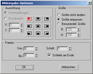Das Dialogfeld "Bildeingabe-Optionen" enthält Steuerelemente für die Einstellung der Größe und Platzierung des Bilds in Relation zu den Frames der Video-Ausgabe. Bei animierter Eingabe verwenden Sie es auch zum Synchronisieren der Bildeingabeaktion mit der Frame-Sequenz der Video-Ausgabe. Das gleiche Dialogfeld wird angezeigt, wenn Sie im Bereich "Maske" der Dialogfelder für Filteraktionen und Layeraktionen auf "Optionen" klicken.