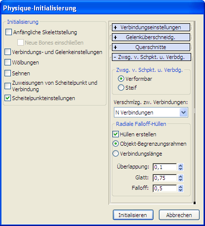 Müssen die Parameter für Scheitelpunkte, Hüllen oder andere Hautparameter auf ein Physique-Netz zurückgesetzt werden, klicken Sie auf "Neu initialisieren", um das Dialogfeld "Physique-Initialisierung" zu öffnen. Mit den Steuerelementen in diesem Dialogfeld können Sie die Kategorie bestimmen, die aktualisiert werden soll, und die neuen globalen Einstellungen anwenden.