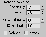 Durch die Parameter für "Radiale Skalierung" wird die Haut gedehnt oder zusammengezogen, indem die radiale Entfernung im rechten Winkel zur Verbindung skaliert wird. Sie gelten für die benutzerdefinierte Skalierung, die Wölbungseinstellungen und/oder die Verbindungslänge.