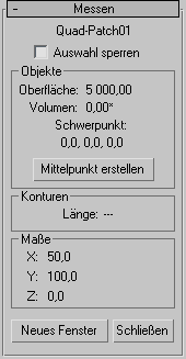 Blendet ein modusunabhängiges Dialogfeld "Messen" ein, in dem die gleichen Informationen wie im Bereich "Objekte, Konturen und Maße" der Dienstprogrammgruppe angezeigt werden. Zusätzlich können Sie das Dialogfeld horizontal erweitern, falls die Werte zu lang sind, um in der Standardgröße des Dialogfelds angezeigt zu werden.