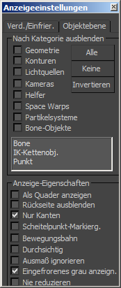 Aktiviert/deaktiviert die Anzeige von Elementen nach Kategorie (Objekte, Kameras, Lichtquellen usw.). Aktivieren Sie die Kontrollkästchen, um Objekte der betreffenden Kategorie auszublenden. Mit den Schaltflächen Alle, Keine und Invertieren können Sie die Einstellungen der Kontrollkästchen ändern.