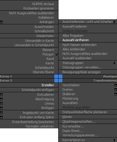 Die zwei Quadranten auf der linken Seite des Vorgabe-Quad-Menüs heißen "Extras 1" und "Extras 2". Diese Quadranten enthalten spezielle Befehle für verschiedene Geometrien und Modifikatoren wie beispielsweise Lichtquellen, bearbeitbare Geometrie einschließlich der aktuellen Unterobjektebene und Kameras. Diese Quadranten werden nur angezeigt, wenn beim Öffnen des Quad-Menüs eines der zugehörigen Elemente ausgewählt ist.