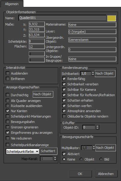 Diese Registerkarte im Dialogfeld "Objekteigenschaften" enthält allgemeine Objektinformationen sowie Steuerelemente zum Rendern des Objekts und zur Anzeige in Ansichtsfenstern.