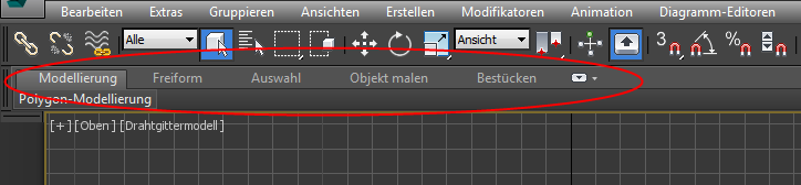 3ds Max startet vorgabegemäß mit der horizontalen Konfiguration der geöffneten Multifunktionsleiste, die bis auf die Gruppentitel minimiert und unterhalb des Hauptwerkzeugkastens fixiert ist. Wenn Sie die Leiste schließen und das Programm beenden, wird sie beim erneuten Programmstart nicht automatisch wieder geöffnet.