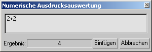 Wenn Sie einen Ausdruck eingeben, wird er ausgewertet, und das Ergebnis wird im Feld "Ergebnis" angezeigt. Klicken Sie auf "Einfügen", um das Ergebnis der Berechnung in das Feld zu übertragen. Klicken Sie auf "Abbrechen", um die Ausdrucksauswertung zu schließen.