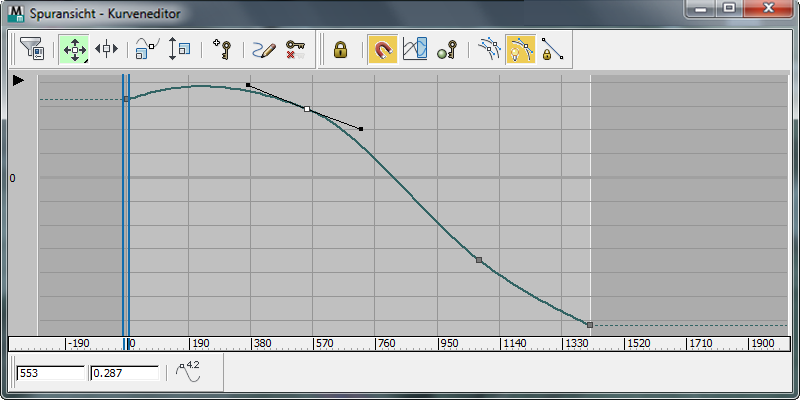 Der Animations-Editor für platzierte Objekte zeigt Bewegung als eine Reihe von Funktionskurven in einem Diagramm. In 3ds Max ist die Bewegung durch eine Serie von Animations-Keys definiert. Die Software berechnet die zwischen den Keys liegenden interpolierten Werte und erstellt eine vollständige Animation.