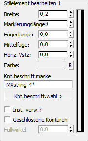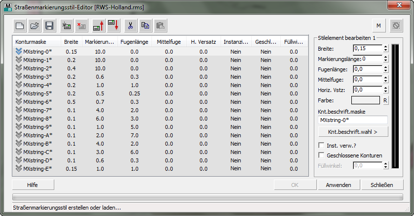 Mit den Steuerelementen im Bereich auf der rechten Seite können Sie die Einstellungen des markierten Straßenmarkierungsstil-Elements bearbeiten.