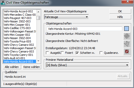 In dieser Gruppe werden alle Objekte in der Szene aufgelistet, die von Civil View erstellt wurden. Dadurch können Sie die Objekte auf verschiedene Arten bearbeiten. Sie können außerdem überprüfen, welches Material auf ein Objekt angewendet wird, und in einigen Fällen auch den Materialkanal ändern.