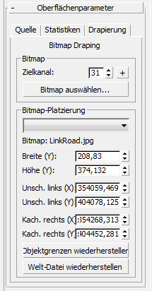 Im CivilViewSurfaces-Material, ist der Kanal 31 als Vorgabekanal für drapierte Bitmaps reserviert. Daher verwenden die Steuerelemente in diesem Rollout bei Flächen oder Dreiecken in der Regel Kanal 31. Dennoch können Sie Bitmaps auch mit einem anderen Materialkanal oder einer anderen Material-ID auf Flächen drapieren.